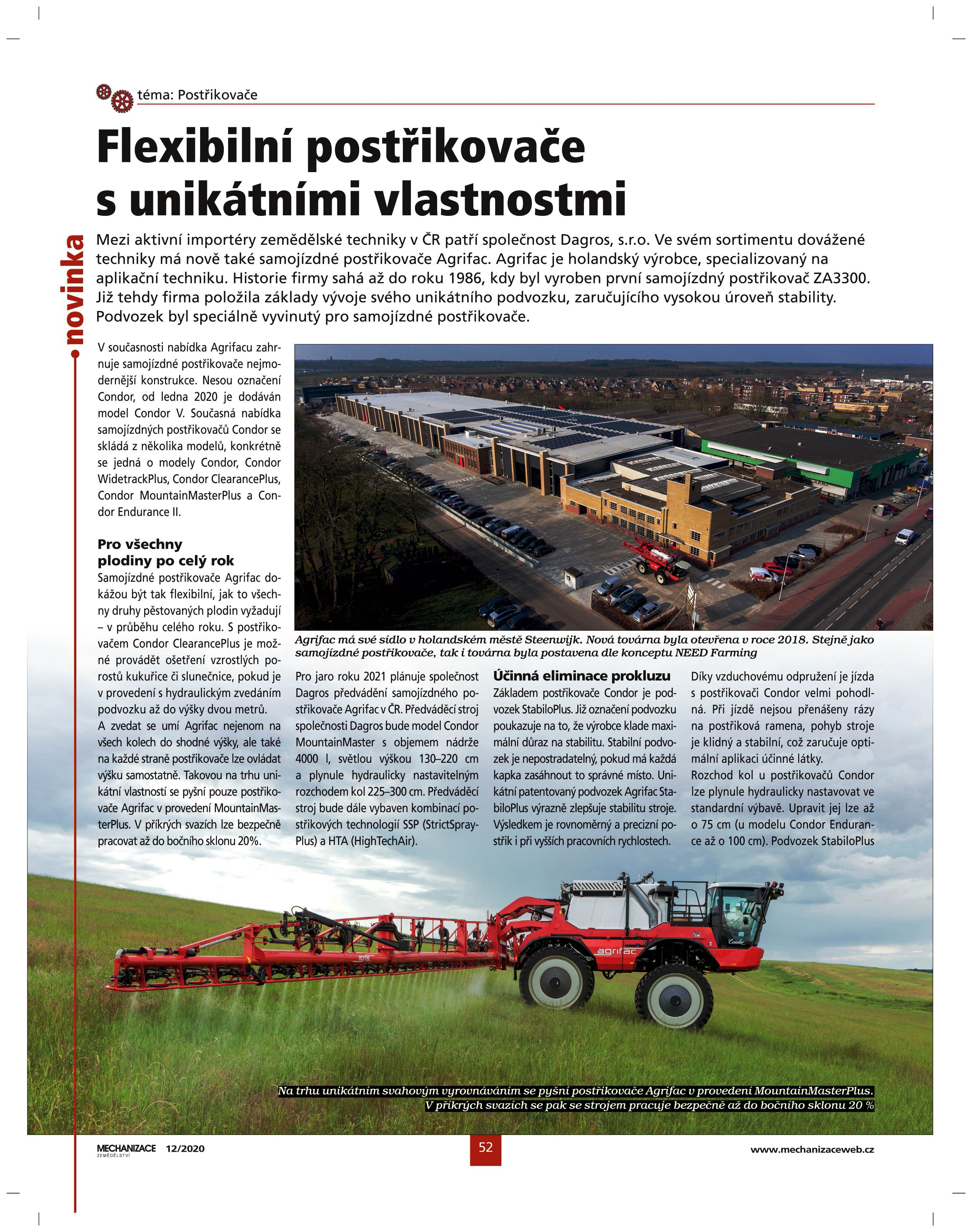 V aktuálním vydaní časopisu Mechanizace zemědělství 12/2020 naleznete článek o samojízdných postřikovačích Agrifac.