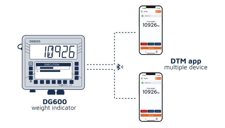 Váhy DG600 bude možné nově pořídit s integrovaným rozhraním Bluetooth, které slouží k přímému připojení váhy k aplikaci DTM8. Tím může krmič vzdáleně ovládat váhu v reálném čase přímo z tabletu nebo mobilního telefonu umístěného v nakladači.